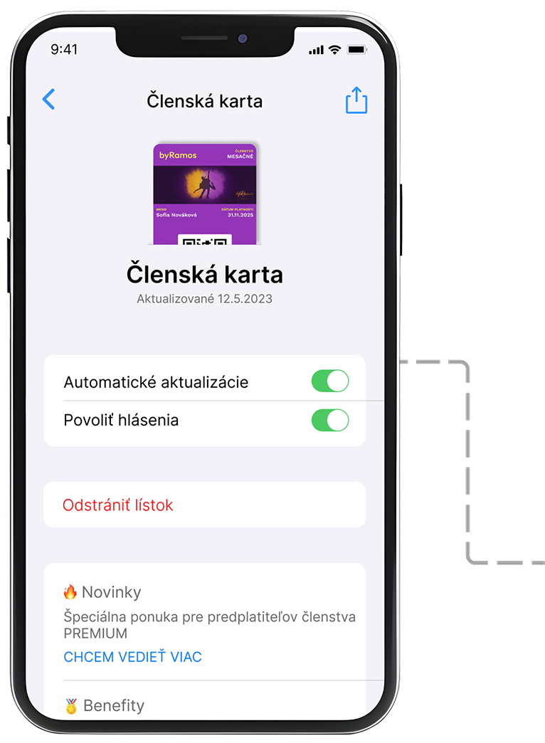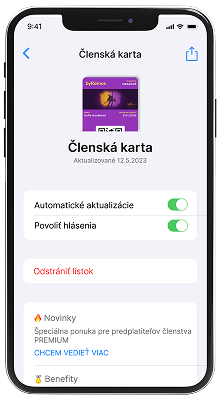 Digitálna karta sa automaticky aktualizuje. Takže vždy keď ju otvoríš, nájdeš aktuálne informácie, aktuálne benefity a všetko dôležité z našej komunity. Kartu vieš aktualizovať aj manuálne potiahnutím dole.